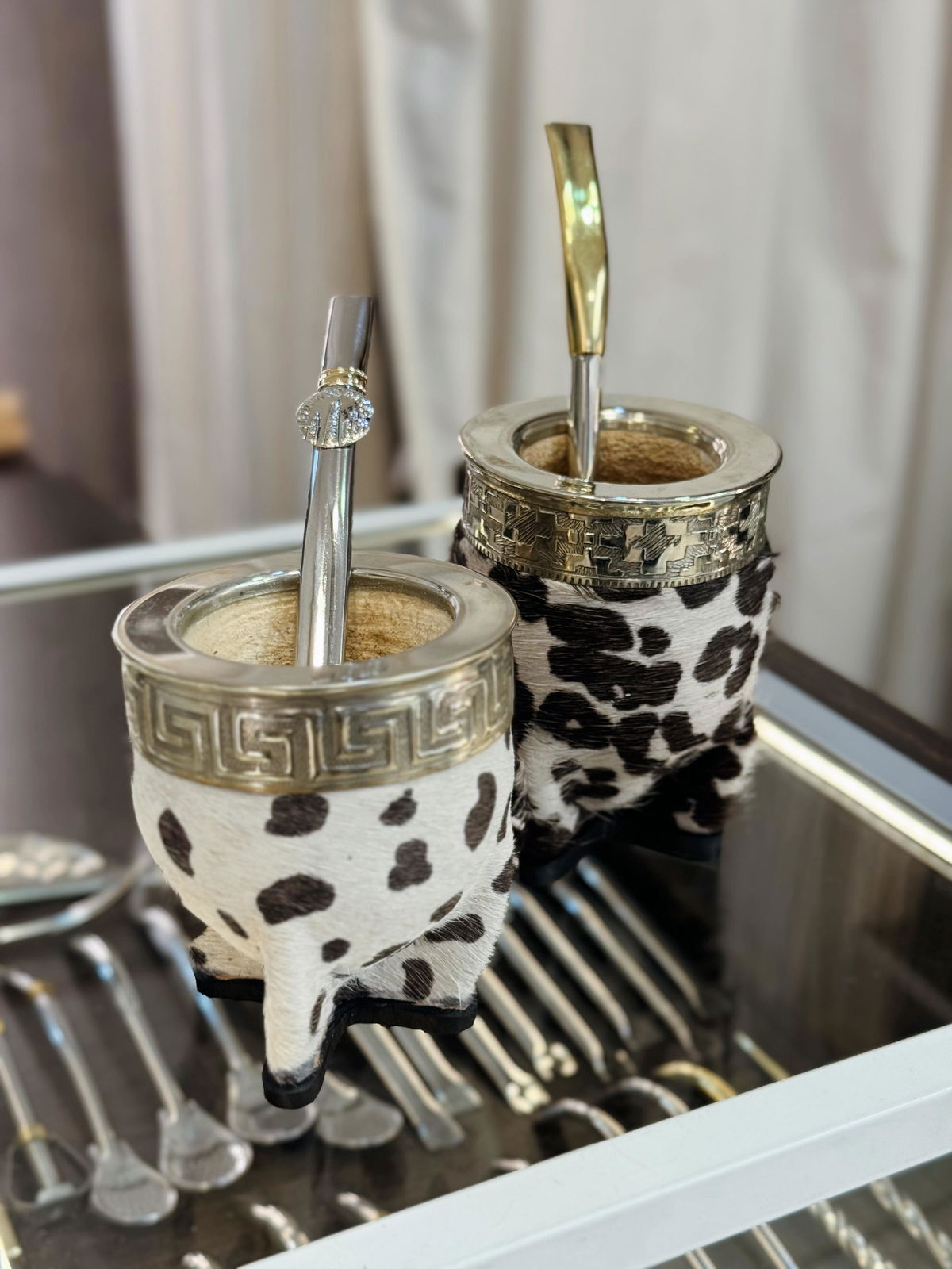 Elaborado con calabaza natural seleccionada, su forrado en cuero con estampado vaquita aporta un estilo único, rústico y elegante a la vez. La virola y fleje de alpaca ofrece durabilidad, brillo y resistencia al uso diario, manteniendo el equilibrio perfecto entre lo clásico y lo moderno.