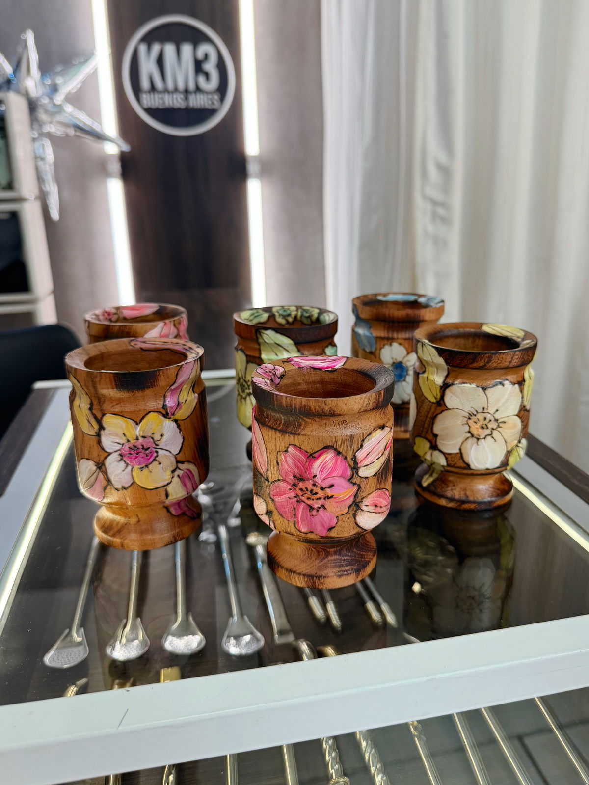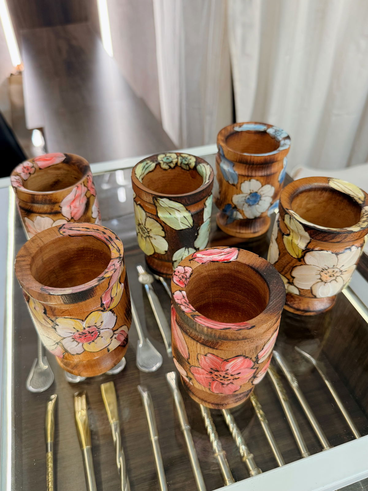 Mate artesanal realizado en madera de algarrobo, pintado a mano con delicados diseños florales. Cada pieza es única, combinando tradición, calidad y estética. Ideal para el uso diario o para regalar.